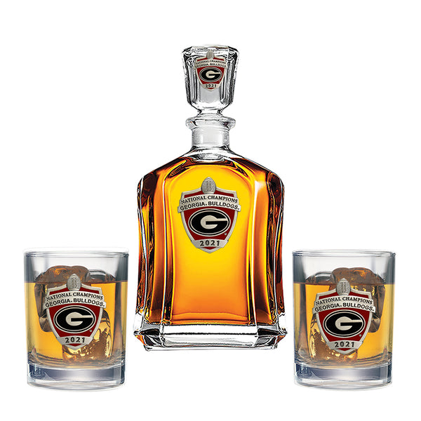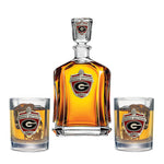 This 24-ounce glass decanter is embellished with a fine pewter casting. It comes with two Double Old Fashioned glasses. A great addition to any home bar! Made in USA.