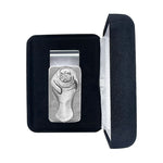 This money clip is made with super spring steel. It will hold one bill or a giant stack! The best looking and functioning clip you will ever own! The fine pewter detail is intricate. Comes with a velour hinged gift box. Made in USA.