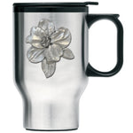 This double wall stainless steel travel mug is insulated and it is stainless inside and out. It is embellished with a fine pewter decorative casting. The lid has a non-spill...