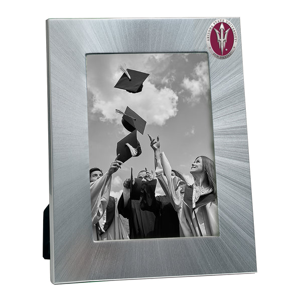 This photo frame is fabricated with brushed aluminum and accented with a fine pewter casting. Protective glass and easelback included. Assembled in USA.