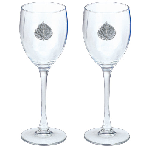 This is a set of two 12 ounce glass goblets with a fine pewter logo medallion bonded to the side. It could be used to serve water, wine or other beverages. Made in USA.