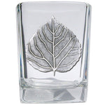 This 1.5 ounce square shot glass is highlighted with a fine pewter casting. Made in USA.