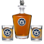 This is a set of a 25-ounce glass decanter with a fine pewter casting, 3D Topper, and two Double Old Fashioned Glasses. A great addition to any home bar! Made in USA.