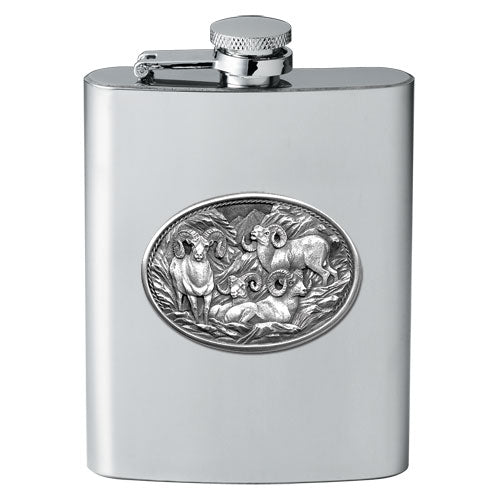 This 8 ounce stainless steel flask is embellished with a fine pewter casting. Assembled in USA.
