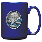 This coffee mug is decorated with a fine pewter casting. It is microwaveable and dishwasher safe with no heat cycle.. The glass coffee mug is 16 ounces, and the ceramic coffee mug is 15 ounces.