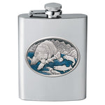 This 8 ounce stainless steel flask is embellished with a fine pewter casting. Assembled in USA.