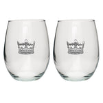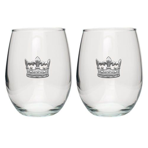 This is a set of two 12 ounce glass goblets with a fine pewter logo medallion bonded to the side. It could be used to serve water, wine or other beverages. Made in USA.