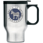 This double wall stainless steel travel mug is insulated and it is stainless inside and out. It is embellished with a fine pewter decorative casting. The lid has a non-spill...