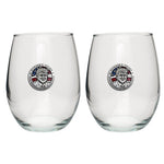 This is a set of two 12 ounce glass goblets with a fine pewter logo medallion bonded to the side. It could be used to serve water, wine or other beverages. Made in USA.