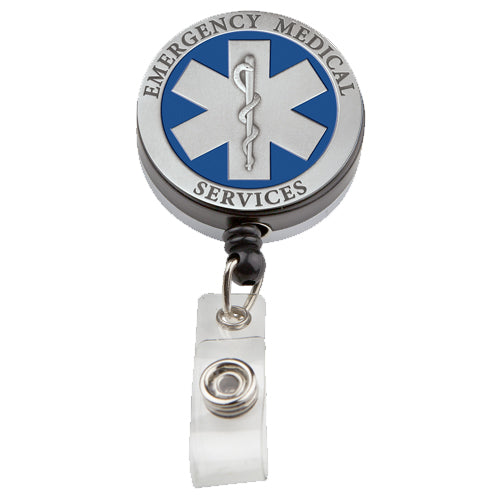 This is a badge reel with fine pewter logo medallion boded in front. It has a retractable cord and belt clip on the back side. Made in USA.