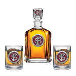 This 24-ounce glass decanter is embellished with a fine pewter casting. It comes with two Double Old Fashioned glasses. A great addition to any home bar! Made in USA.