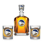 This 24-ounce glass decanter is embellished with a fine pewter casting. It comes with two Double Old Fashioned glasses. A great addition to any home bar! Made in USA.