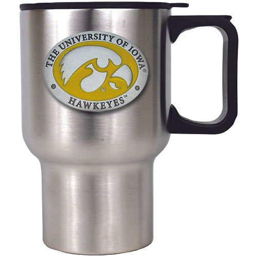 This double wall stainless steel travel mug is insulated and it is stainless inside and out. It is embellished with a fine pewter decorative casting. The lid has a non-spill feature.