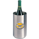 This is a wine chiller made of double-wall insulated stainless steel with a fine pewter logo medallion bonded to the front.