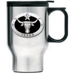 This double wall stainless steel travel mug is insulated and it is stainless inside and out. It is embellished with a fine pewter decorative casting. The lid has a non-spill feature.