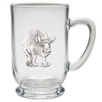 This coffee mug is decorated with a fine pewter casting. It is microwaveable and dishwasher safe with no heat cycle.. The glass coffee mug is 16 ounces, and the ceramic coffee mug is 15 ounces.