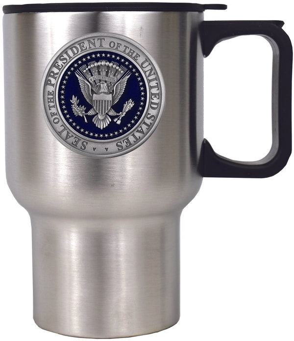 This double wall stainless steel travel mug is insulated and it is stainless inside and out. It is embellished with a fine pewter decorative casting. The lid has a non-spill feature.