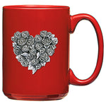 This coffee mug is decorated with a fine pewter casting. It is microwaveable and dishwasher safe with no heat cycle.. The glass coffee mug is 16 ounces, and the ceramic coffee mug is 15 ounces.