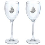 This is a set of two 12 ounce glass goblets with a fine pewter logo medallion bonded to the side. It could be used to serve water, wine or other beverages. Made in USA.