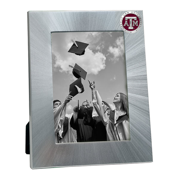 This photo frame is fabricated with brushed aluminum and accented with a fine pewter casting. Protective glass and easelback included. Assembled in USA.