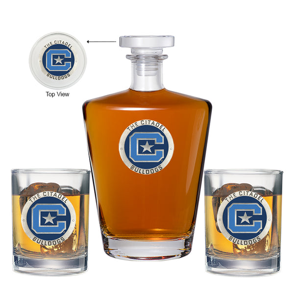 This 25 ounce glass decanter is embellished with a fine pewter casting. Added 14 ounce two double old fashioned glass is the ultimate vessel for your favorite beverage. It is exquisitely detailed with a fine pewter casting. Made in USA.