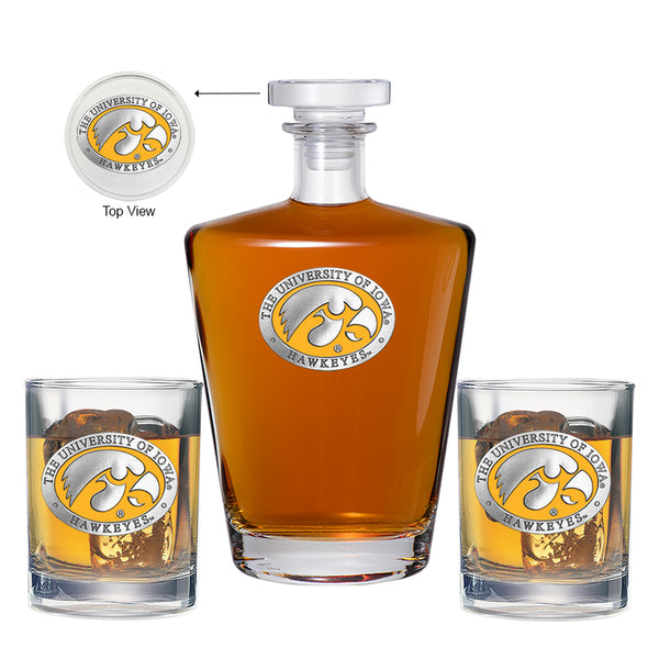 This 25 ounce glass decanter is embellished with a fine pewter casting. Added 14 ounce two double old fashioned glass is the ultimate vessel for your favorite beverage. It is exquisitely detailed with a fine pewter casting. Made in USA.