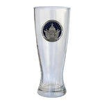 This is a 20 ounce pilsner glass with a fine pewter logo medallion bonded to the front.. It is exquisitely detailed with a fine pewter casting. Made in USA.