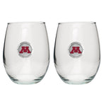 This is a set of two 12 ounce glass goblets with a fine pewter logo medallion bonded to the side. It could be used to serve water, wine or other beverages. Made in USA.