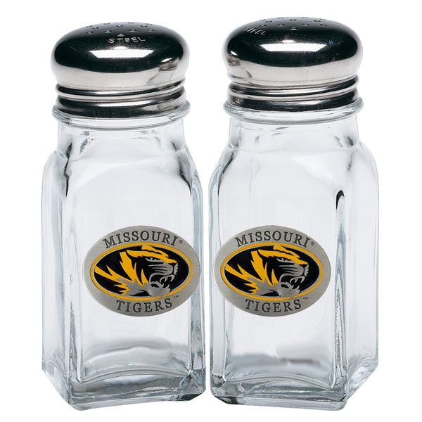 This is a set of salt & pepper shakers with a fine pewter logo medallion bonded to the side. Made in USA.