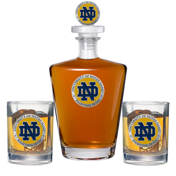 This is a set of a 25-ounce glass decanter with a fine pewter casting, 3D Topper, and two Double Old Fashioned Glasses. A great addition to any home bar! Made in USA.