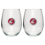 This is a set of two 12 ounce glass goblets with a fine pewter logo medallion bonded to the side. It could be used to serve water, wine or other beverages. Made in USA.