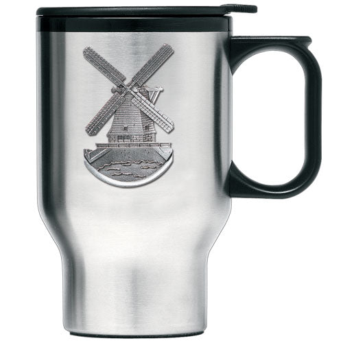 This double wall stainless steel travel mug is insulated and it is stainless inside and out. It is embellished with a fine pewter decorative casting. The lid has a non-spill...
