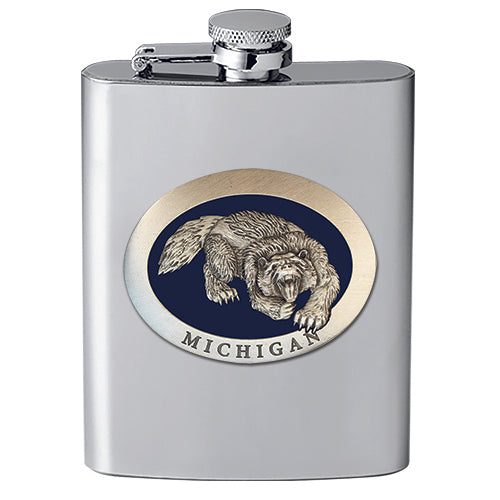 This 8 ounce stainless steel flask is embellished with a fine pewter casting. Assembled in USA.