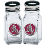 This is a set of salt & pepper shakers with a fine pewter logo medallion bonded to the side. Made in USA.