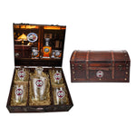 This Royal Decanter Chest Set with 24 OZ Capitol Decanter with 3D Top and 4 Double Old-Fashioned Glasses Expertly Crafted Pewter Glass. A great addition to any home bar! Made in USA.