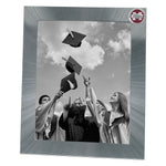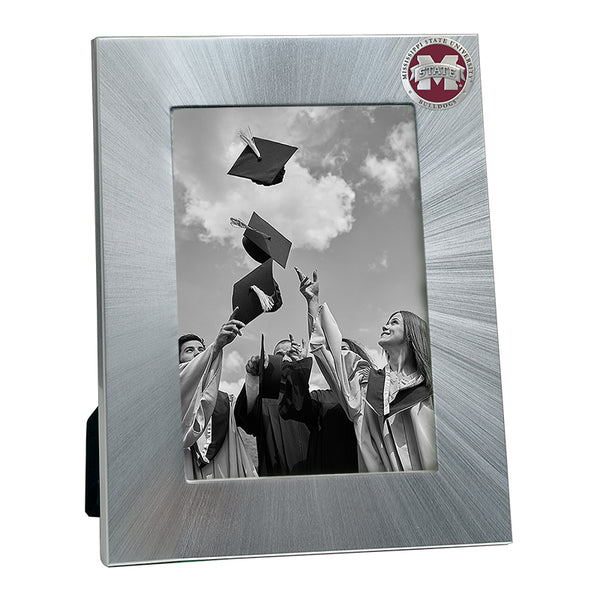 This photo frame is fabricated with brushed aluminum and accented with a fine pewter casting. Protective glass and easelback included. Assembled in USA.