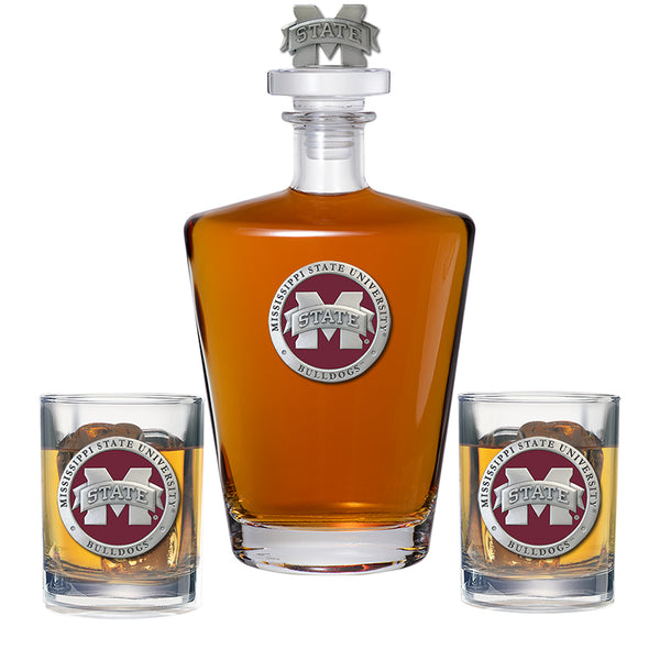 This is a set of a 25-ounce glass decanter with a fine pewter casting, 3D Topper, and two Double Old Fashioned Glasses. A great addition to any home bar! Made in USA.