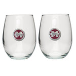 This is a set of two 12 ounce glass goblets with a fine pewter logo medallion bonded to the side. It could be used to serve water, wine or other beverages. Made in USA.