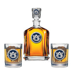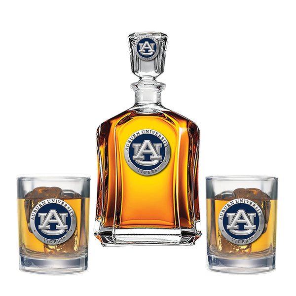 This 24-ounce glass decanter is embellished with a fine pewter casting. It comes with two Double Old Fashioned glasses. A great addition to any home bar! Made in USA.