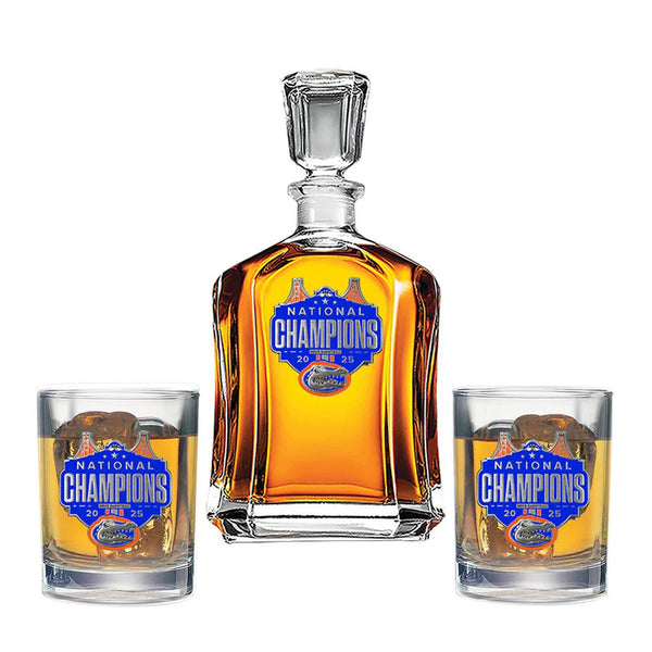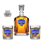 This 24-ounce glass decanter is embellished with a fine pewter casting. It comes with two Double Old Fashioned glasses. A great addition to any home bar! Made in USA.