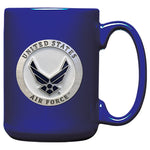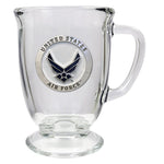 This coffee mug is decorated with a fine pewter casting. It is microwaveable and dishwasher safe with no heat cycle.. The glass coffee mug is 16 ounces, and the ceramic coffee mug is 15 ounces.