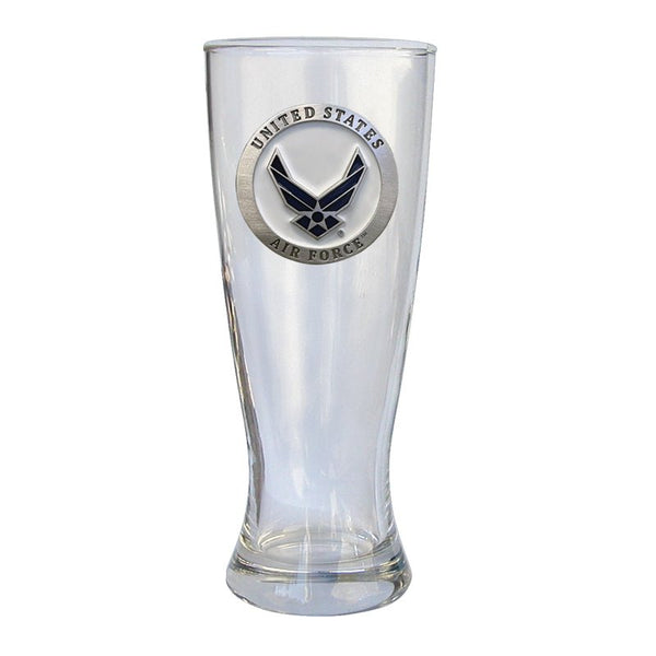 This is a 20 ounce pilsner glass with a fine pewter logo medallion bonded to the front.. It is exquisitely detailed with a fine pewter casting. Made in USA.