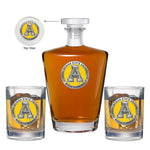 This 25 ounce glass decanter is embellished with a fine pewter casting. Added 14 ounce two double old fashioned glass is the ultimate vessel for your favorite beverage. It is exquisitely detailed with a fine pewter casting. Made in USA.