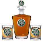 This is a set of a 25-ounce glass decanter with a fine pewter casting, 3D Topper, and two Double Old Fashioned Glasses. A great addition to any home bar! Made in USA.