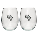 This is a set of two 12 ounce glass goblets with a fine pewter logo medallion bonded to the side. It could be used to serve water, wine or other beverages. Made in USA.