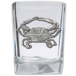This 1.5 ounce square shot glass is highlighted with a fine pewter casting. Made in USA.