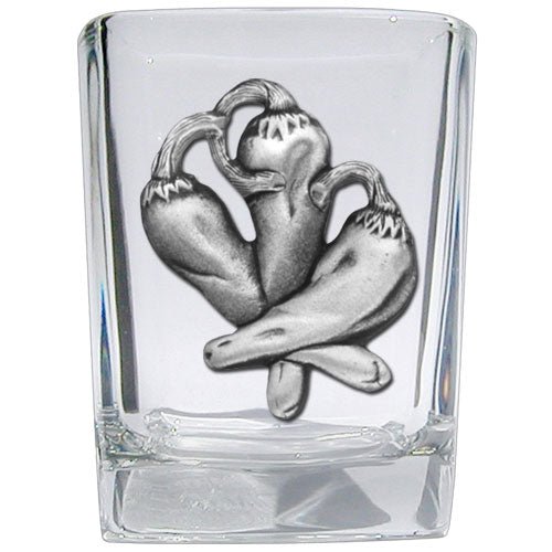 This 1.5 ounce square shot glass is highlighted with a fine pewter casting. Made in USA.