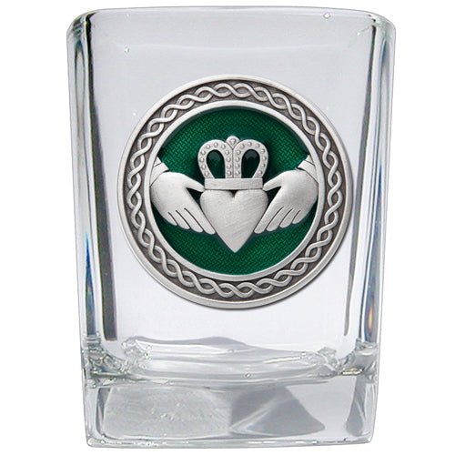 This 1.5 ounce square shot glass is highlighted with a fine pewter casting. Made in USA.