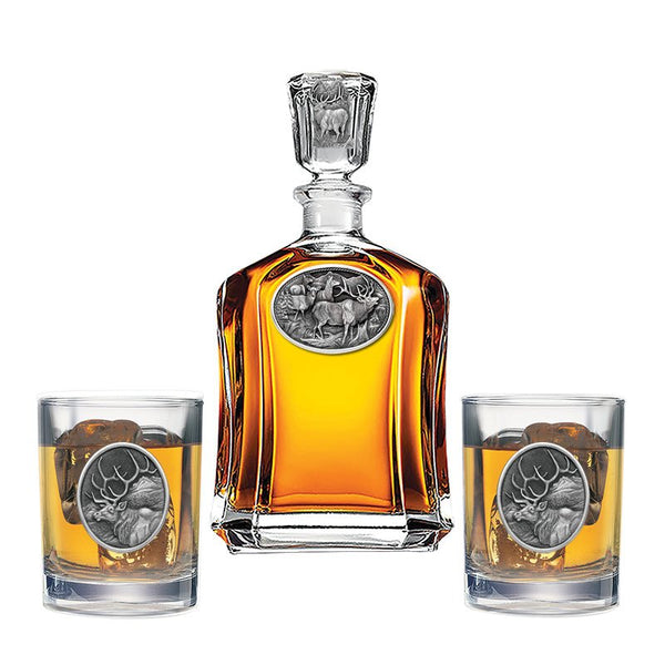 This 24-ounce glass decanter is embellished with a fine pewter casting. It comes with two Double Old Fashioned glasses. A great addition to any home bar! Made in USA.