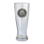 This is a 20 ounce pilsner glass with a fine pewter logo medallion bonded to the front.. It is exquisitely detailed with a fine pewter casting. Made in USA.